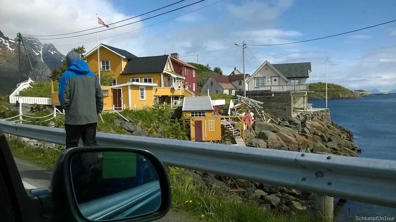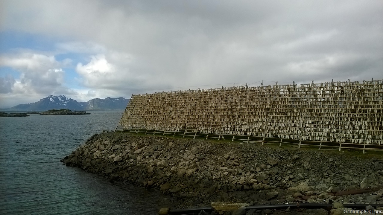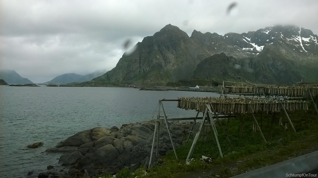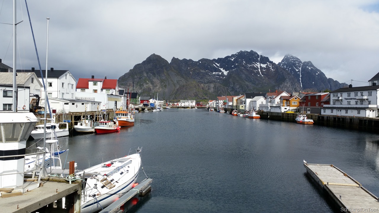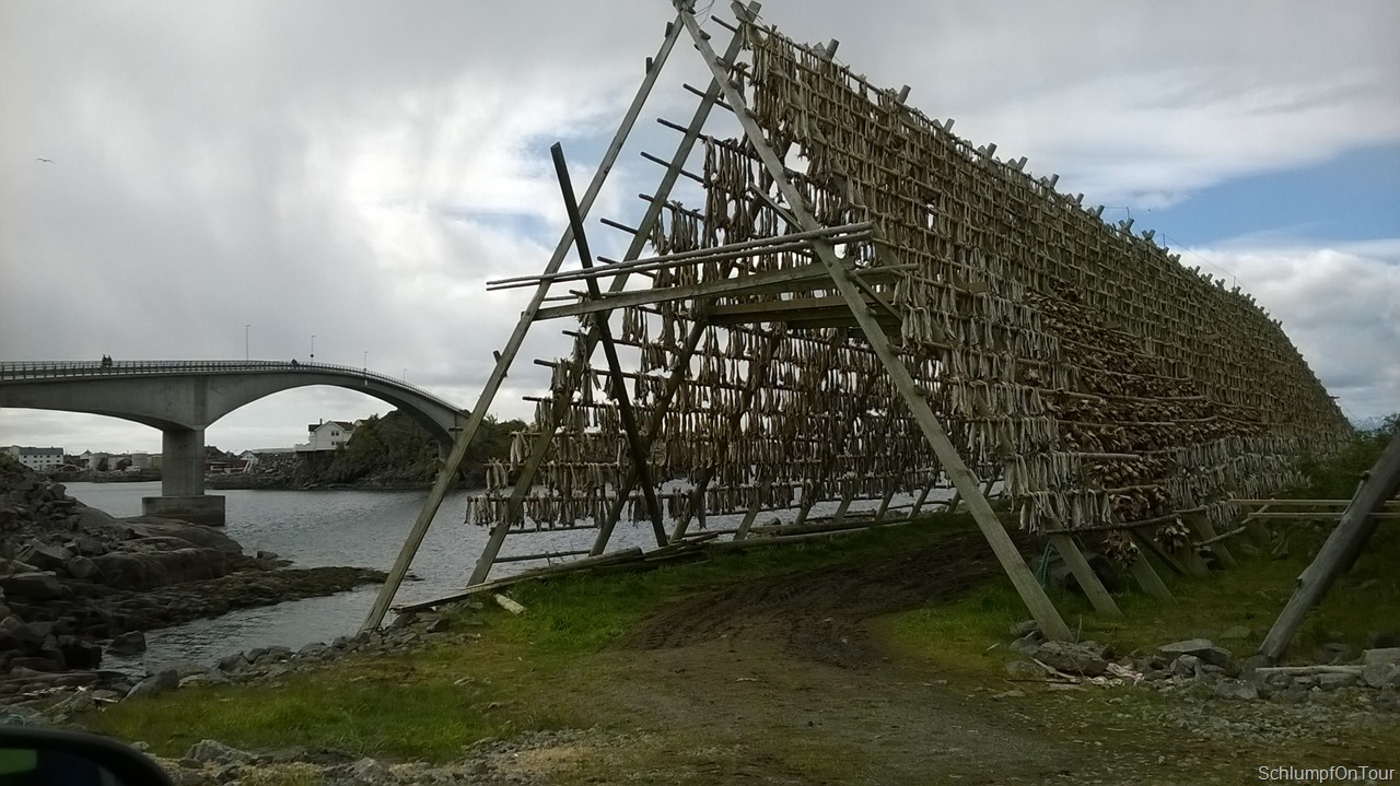 Im Internet sind wird aufmerksam auf Henningsvear geworden, ein kleines Dorf mitten auf ein paar Inseln. Anders als das Dorf “A” am Ende der Lofoten noch heute bedeutend für den Fischfang. Warum das aber so ist, konnten wir bis jetzt nicht herausfinden. Angeblich sollen die Inseln nahe an fischreichen Regionen liegen. Überall im Dorf sieht man auch den Stockfisch / Klippfisch hängen. Ob nur vereinzelnd an Wäschespinnen, Balkons oder aber im großen Stihl an dafür gebauten Vorrichtungen über mehrere Meter. Zu erreichen ist das Dorf nur mittels zweier einspuriger Brücken. Und wenn man denkt, dass so ein paar Inseln im Wasser flach sind, täuscht sich zudem auch sehr gewaltig. In Henningsvear hat man ein paar schmale und bergige Wege, wie man sie z.B. aus Goslar kennt. Nur die Häuserkulisse ist eher nordisch. Im Reiseführer – die www.lofoten.info wird das Dorf wie folgt beschrieben: