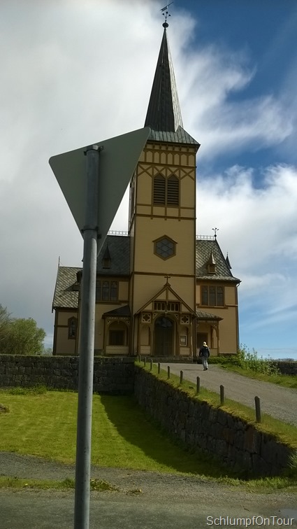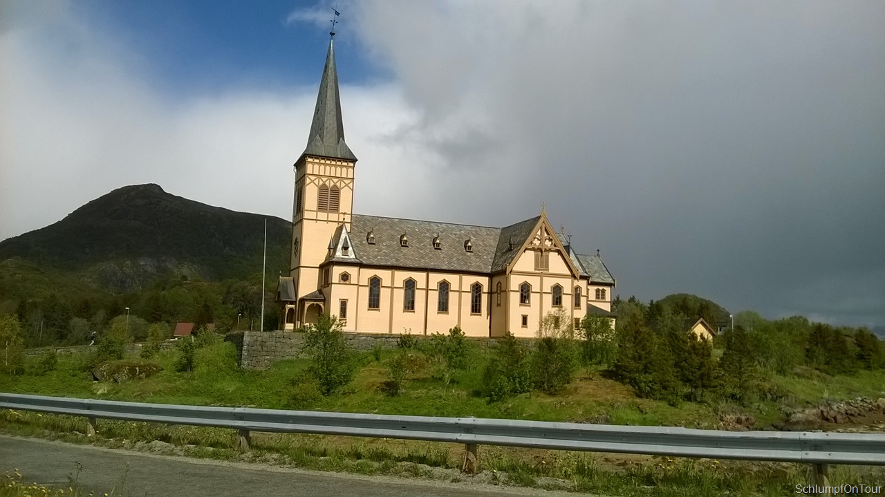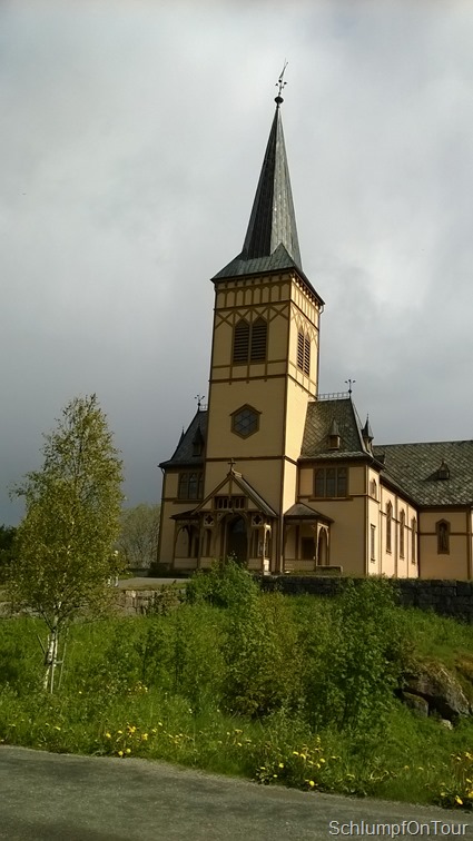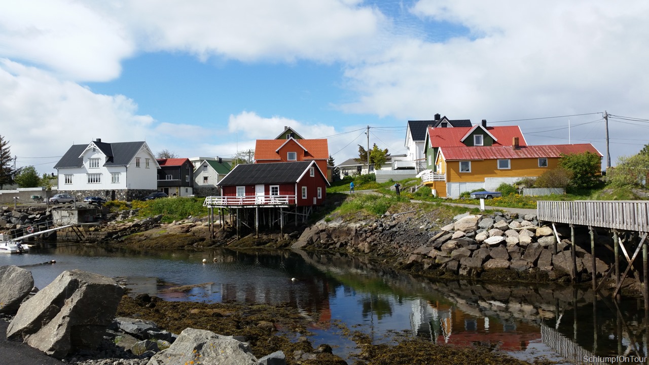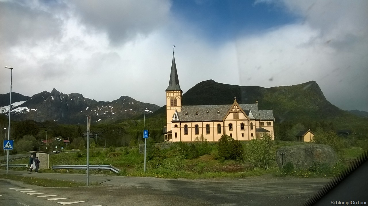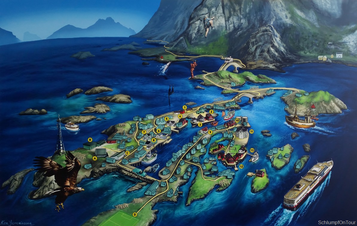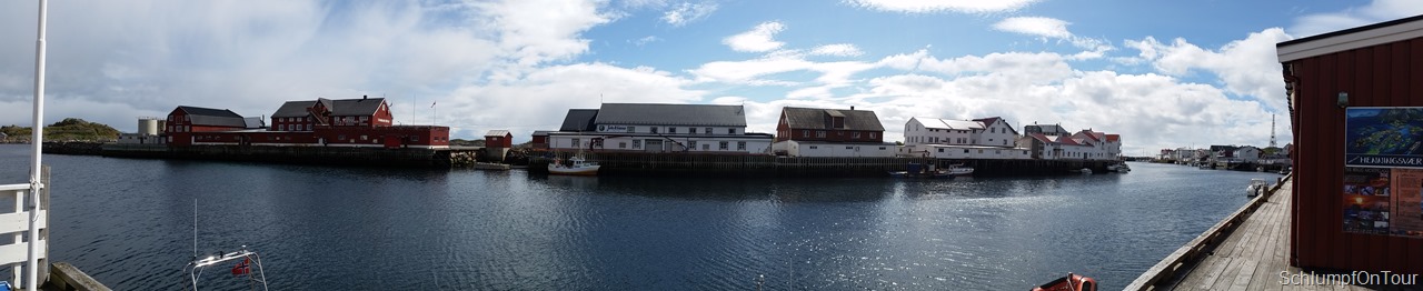 Im Internet sind wird aufmerksam auf Henningsvear geworden, ein kleines Dorf mitten auf ein paar Inseln. Anders als das Dorf “A” am Ende der Lofoten noch heute bedeutend für den Fischfang. Warum das aber so ist, konnten wir bis jetzt nicht herausfinden. Angeblich sollen die Inseln nahe an fischreichen Regionen liegen. Überall im Dorf sieht man auch den Stockfisch / Klippfisch hängen. Ob nur vereinzelnd an Wäschespinnen, Balkons oder aber im großen Stihl an dafür gebauten Vorrichtungen über mehrere Meter. Zu erreichen ist das Dorf nur mittels zweier einspuriger Brücken. Und wenn man denkt, dass so ein paar Inseln im Wasser flach sind, täuscht sich zudem auch sehr gewaltig. In Henningsvear hat man ein paar schmale und bergige Wege, wie man sie z.B. aus Goslar kennt. Nur die Häuserkulisse ist eher nordisch. Im Reiseführer – die www.lofoten.info wird das Dorf wie folgt beschrieben: