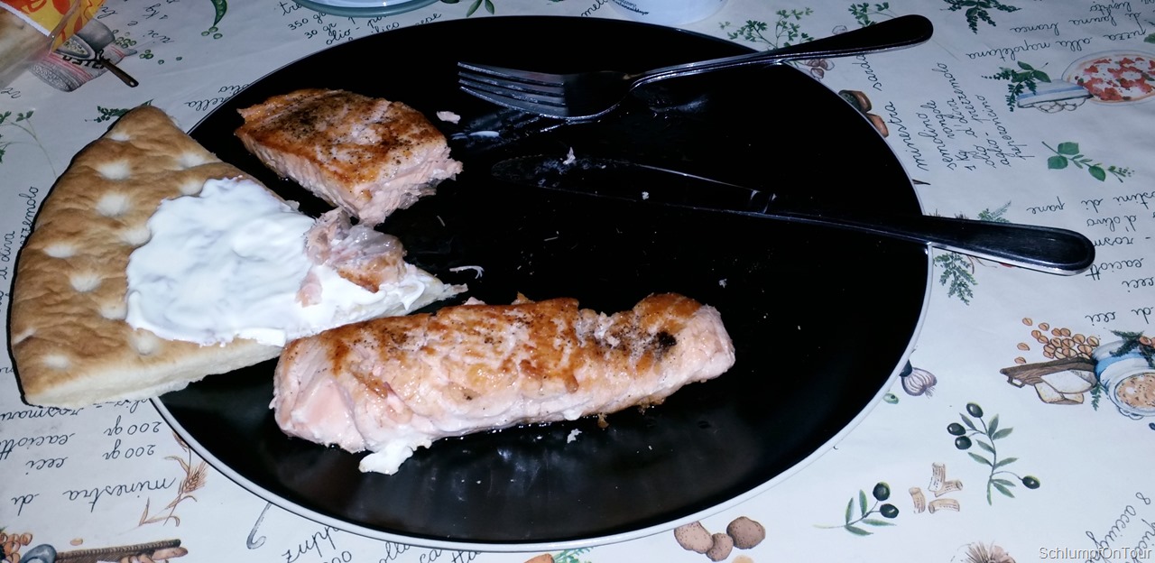 Lachs nur mit Salz und Pfeffer anbraten. Dazu Römme und Weizendreiecke! Total einfach und auch sehr lecker.![]()